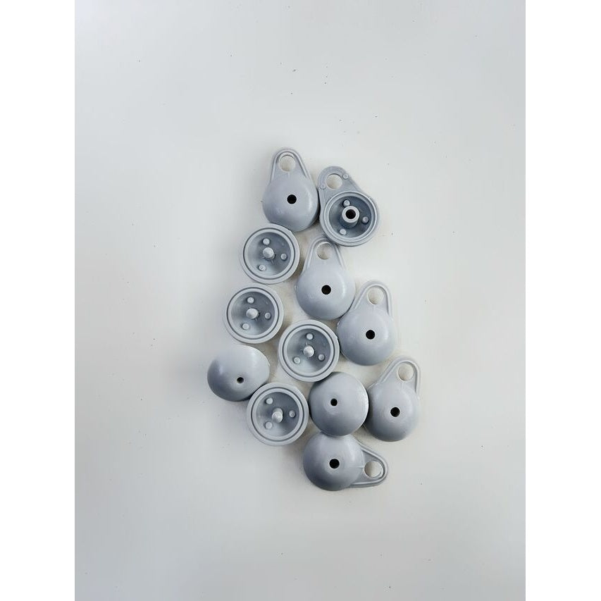 Die Clips sind aus robustem Plastik gefertigt und in Grau gehalten. Mit einem Durchmesser von 3,5 cm und einer Höhe von 1 cm bieten sie festen Halt, ohne den Teppich zu beschädigen.