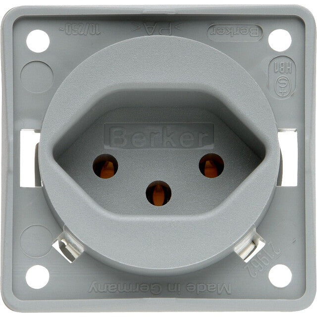 Steckdose Berker in Schweizer Ausführung – 3‑polig, 10 A, 250 V, in elegantem Grau matt. Diese Einbausteckdose bietet zuverlässige Stromversorgung und passt ideal in moderne Wohn- und Büroinstallationen.