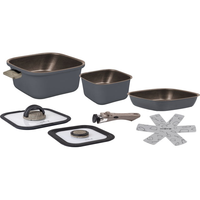 Das 8-tlg. Torralta Square Topfset in dunkelgrau wurde speziell für Camping, Wohnmobil- und Bootsnutzung entwickelt. Die quadratische Form (20 x 20 cm und 16 x 16 cm) spart Platz und erlaubt ein schlankes, stapelbares Aufbewahren – perfekt bei begrenztem Stauraum.