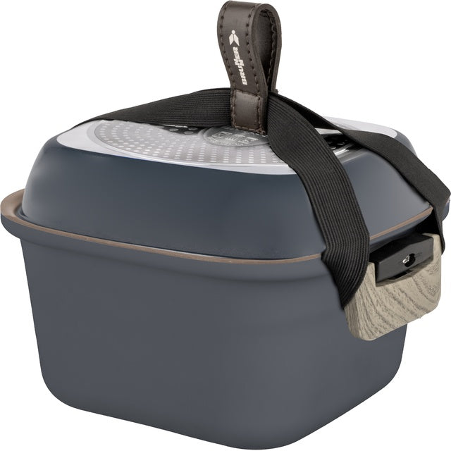 Lieferumfang (8-tlg.): Topf 20 x 20 cm, Pfanne 20 x 20 cm, Topf 16 x 16 cm, Deckel 20 x 20 cm, Deckel 20/18/16 cm, abnehmbarer Griff, Topfschoner und Topfhalteband. Das robuste, dunkle Design kombiniert Funktionalität mit modernem Look – ideal für unterwegs und Zuhause.
