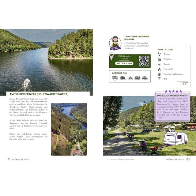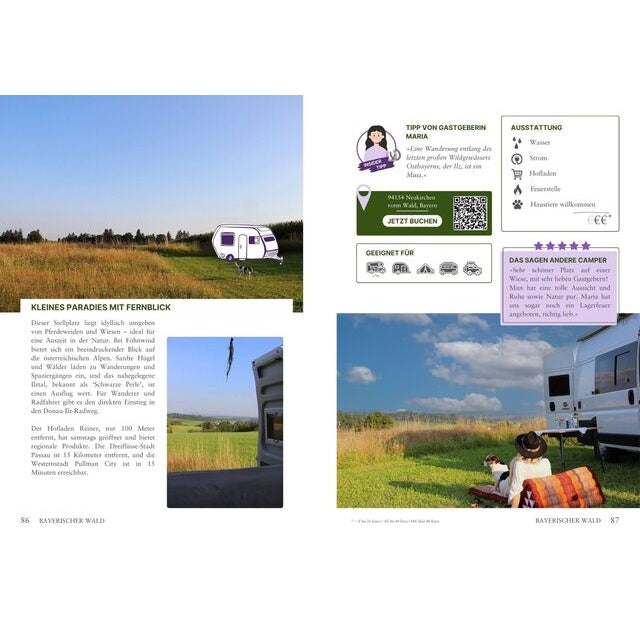 Praktisch: Zu vielen Plätzen gibt es QR-Codes für sofortige Buchung und Live-Verfügbarkeits-Infos – perfekt für spontane Roadtrips. Umfangreiche Regionenguides helfen dir bei der Planung und zeigen die schönsten Highlights jeder Gegend.