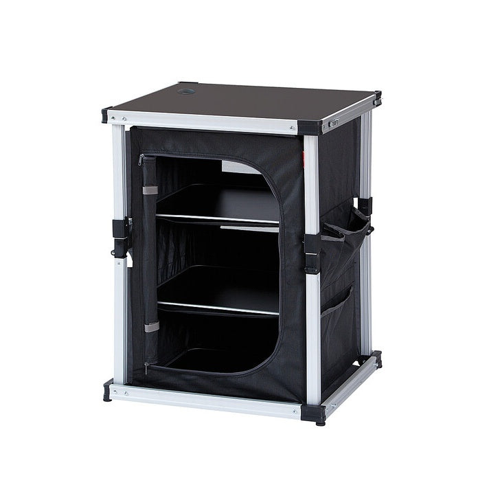 Der Aufbewahrungsschrank Isabella in Schwarz vereint Funktionalität und modernes Design. Er bietet eine stabile Klapptechnik und ist in zwei Größen erhältlich. Mit seinen drei Ablagen und einer maximalen Belastbarkeit von 30 kg ist er perfekt für Camping und Outdoor-Aktivitäten geeignet.
