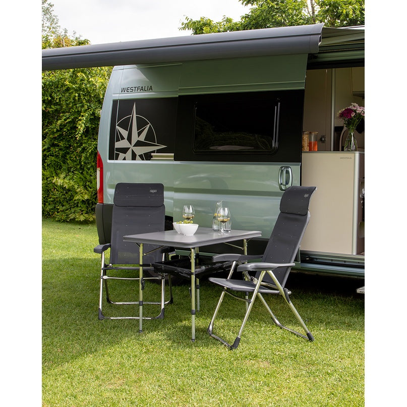 Kompaktes Crespo Stuhl- und Tischset – ideal für Camping, Kastenwagen und Vans. Das Set bietet Platz für 2 Personen und überzeugt durch kleines Packmaß, geringes Gewicht und robustes Aluminiumgestell.