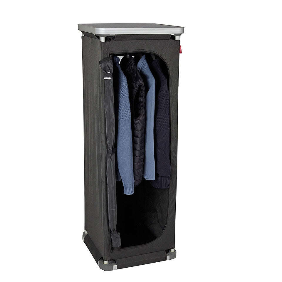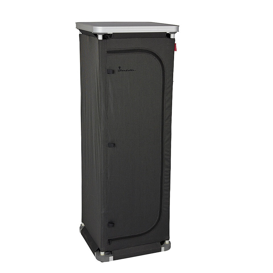 Der Garderobenschrank Isabella in anthrazit bietet reichlich Stauraum mit 4 Ablagen und Garderobentange. Ideal als Aufbewahrungslösung für sämtliches Campingzubehör oder als praktische Garderobe für zu Hause. Dank seines leichten Aluminiumgestells und des robusten Polyesterbezuges ist der Schrank leicht und dennoch stabil. Mit einem Packmaß von nur 50 cm x 18 cm ist er einfach zu transportieren. Maximale Belastbarkeit: 30 kg.