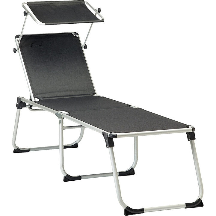 Wetterfester Bezug (60 % PVC, 40 % Polyester) auf einem leichten Aluminiumgestell (100 % Aluminium). Die Liege ist zusammenfaltbar und verfügt über ein verstellbares Kopfteil sowie ein Sonnenschutzdach.