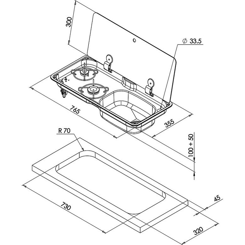 Erleben Sie die vielseitige Koch- / Spülkombination CAN mit zwei Flammen und einer eleganten Glas-Abdeckung. Diese kompakte Lösung ist perfekt für Camping, Reisen oder als zusätzliche Küche im Freien.