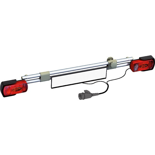 Die Beleuchtungsleiste von EuroCarry ist ein unverzichtbares Zubehör für Fahrradträger, um Rückleuchten und das Kennzeichen sichtbar zu halten. Mit einer Breite von 125 cm und einer eleganten silbernen Eloxierung ist sie sowohl funktional als auch ansprechend. Ideal für sicheres Fahren, wo Fahrräder oder Trägersysteme die Sichtbarkeit beeinträchtigen. Bitte beachten Sie, dass eine 13-polige Steckdose am Fahrzeug vorhanden sein muss.