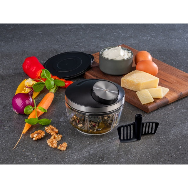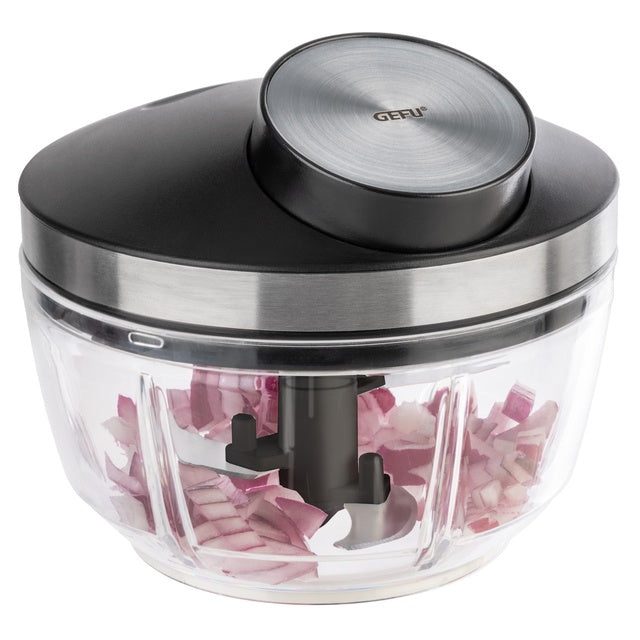Der kompakte GEFU ZIZO Multizerkleinerer in schwarz/silber zerkleinert Obst, Gemüse, Nüsse und Zwiebeln effizient – ganz ohne Strom. Dank des Seilzugmechanismus gelingt schnelles Pürieren, Mischen, Verquirlen und Rühren von Dips, Saucen und Desserts mit minimalem Kraftaufwand.