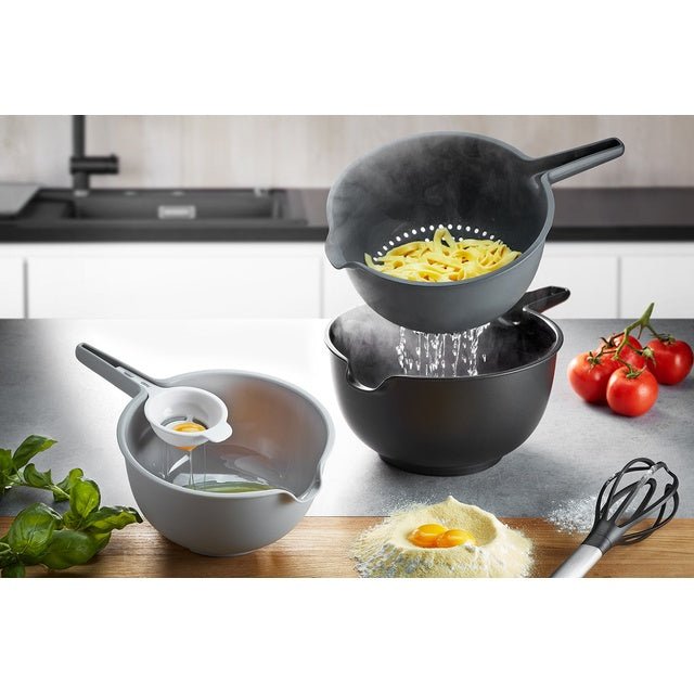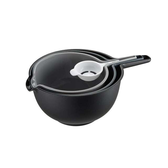 Entdecken Sie das 4-teilige Schüssel-Set GEFU PREPARO in elegantem Schwarz und Grau. Dieses platzsparende Küchenwunder bietet Ihnen: