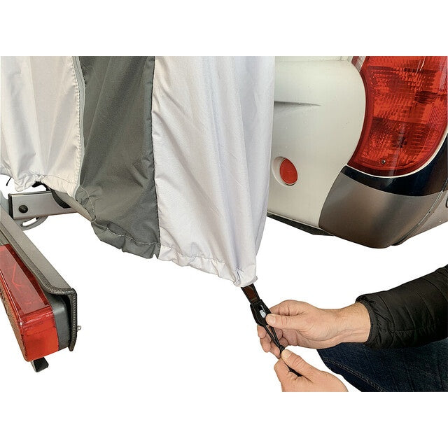 Die HINDERMANN Fahrradschutzhülle PROFESSIONAL schützt bis zu 2 Fahrräder auf Heckträgern von Reisemobilen zuverlässig vor Wetter, Schmutz und Kratzern. Die kastenförmige Hülle wird von oben über die Bikes gezogen und ist rundum geschlossen – trotzdem bleibt die Montage einfach und schnell.