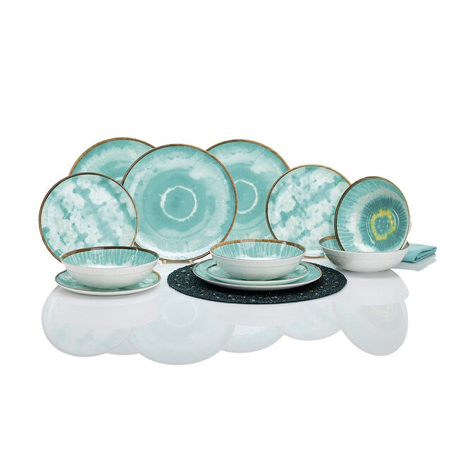 Das 12-teilige Boho Dream Melamin-Geschirrset in türkis kombiniert trendiges Boho-Design mit robuster Alltagstauglichkeit. Ideal für 4 Personen: leicht, bruchsicher und mit rutschfester Unterseite für mehr Stabilität.