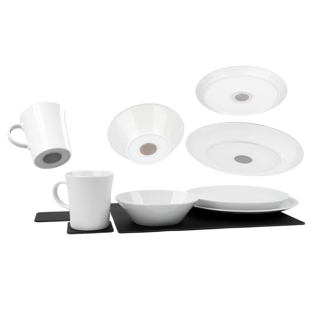 - Komplett-Ausstattung für 2 Personen: 2 Essteller, 2 Dessertteller, 2 Suppenteller, 2 Henkelbecher und 3 Nano-Gel Magnet-Untersetzer