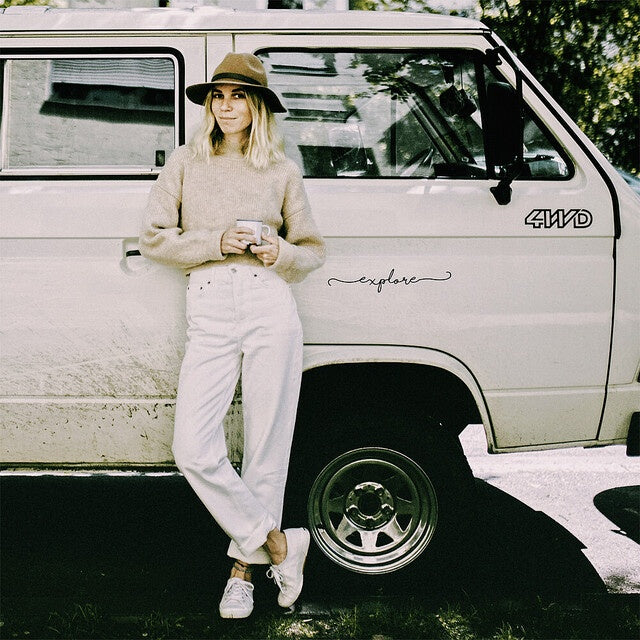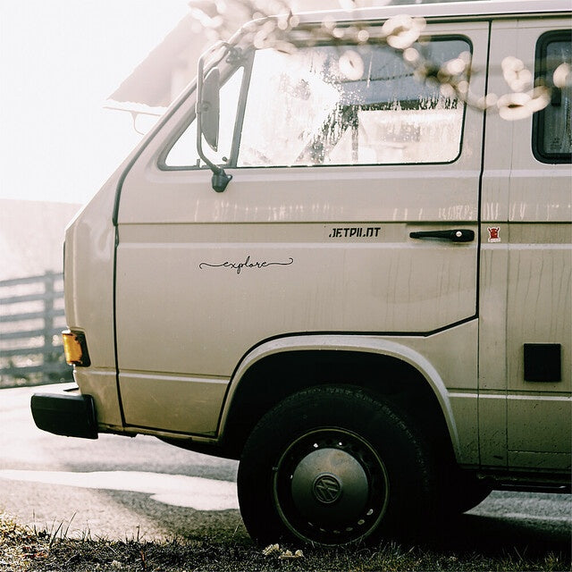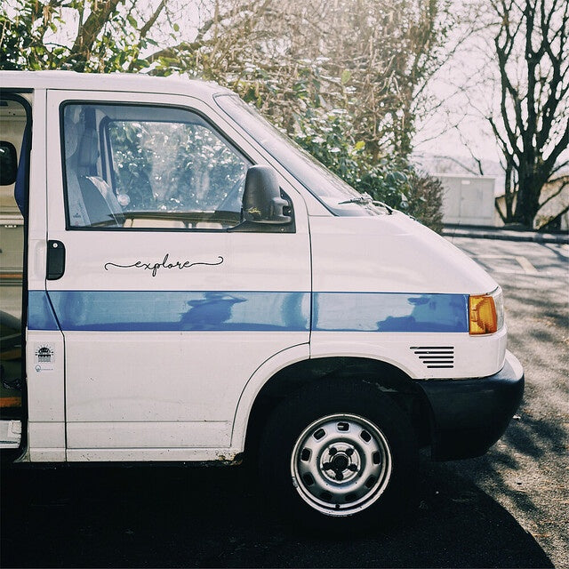 „Explorer“ Autoaufkleber von Advanture Shop – hochwertige, gegossene PVC-Folie in Schwarz. Perfekt für Auto, Bus, Camper, Wohnmobil und andere glatte Außenflächen. Witterungsbeständig und für jahrelange Nutzung konzipiert.