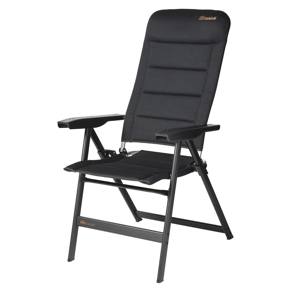 Dukdalf Presto Klappstuhl in schwarz – leichter, gepolsterter Campingstuhl mit stabilem Aluminium-Gestell. Dank 10-facher Verstellbarkeit passt er sich individuell an und bietet langanhaltenden Sitzkomfort beim Camping, Angeln oder im Garten.