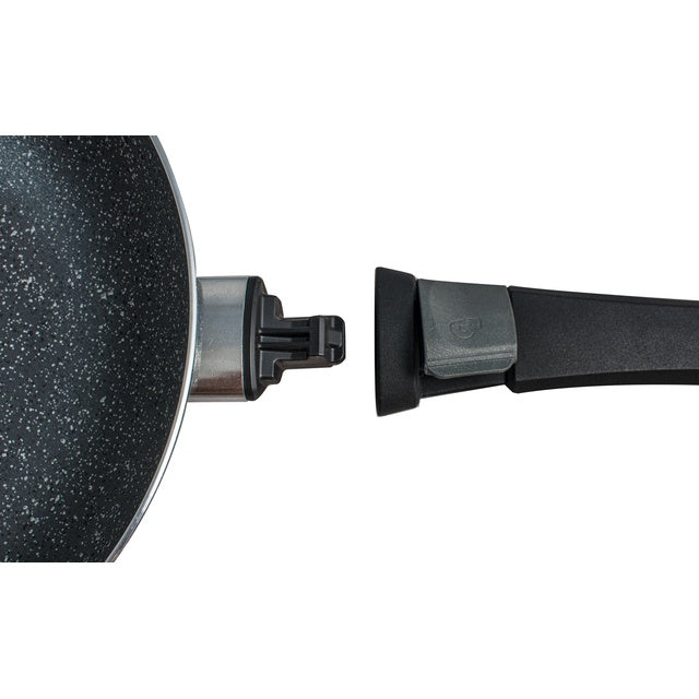 Die STONEROCK Wok-Pfanne 28 cm von Beaver Brand vereint robustes Aluminium mit einer hochwertigen Antihaftbeschichtung. Dank des praktischen Lock-Up Griffs lässt sich die Pfanne platzsparend verstauen; der abnehmbare Griff erleichtert Lagerung und Reinigung. Ideal für Wokgerichte, Pfannengerichte und schnelles Anbraten.