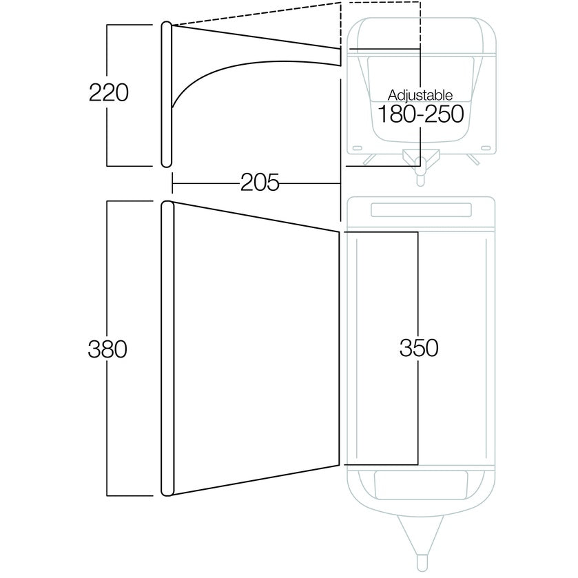 Die Anbauhöhe von 180 cm bis 260 cm ermöglicht eine flexible Installation, ganz nach Ihren Bedürfnissen. Das zeitlose graue Design fügt sich harmonisch in jede Campingumgebung ein und bietet nicht nur Funktionalität, sondern auch Stil.