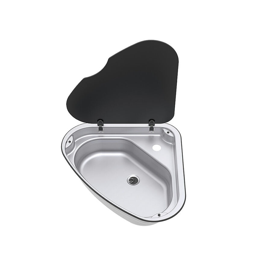 Dieses dreieckige Spülbecken mit einer hochwertigen Glasabdeckung ist die perfekte Lösung für kompakte Küchenräume. Die versetzte Montage auf der rechten Seite ermöglicht eine flexible Nutzung und passt sich ideal Ihrer Kücheneinrichtung an.