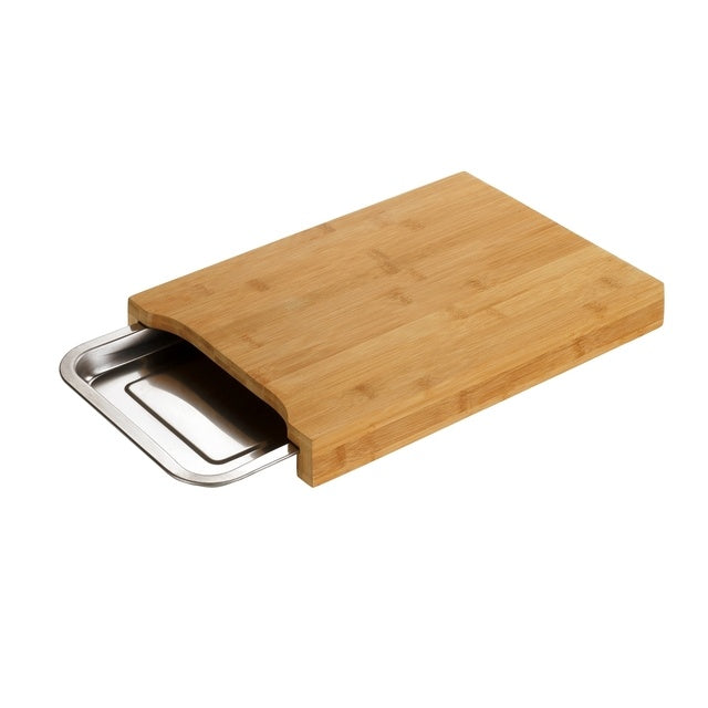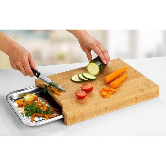 Praktisches Bambus-Schneidebrett von WENKO mit ausziehbarer Edelstahlschale – ideal, um Obst- und Gemüseabfälle direkt aufzufangen und die Arbeitsfläche sauber zu halten. Die herausnehmbare Edelstahl-Auffangwanne lässt sich einfach entleeren und ist spülmaschinengeeignet.