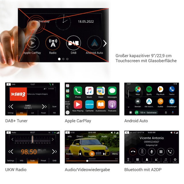 Entdecken Sie den Infotainer XZENT X-127, ein hochmodernes Multimedia-System für Ihr Fahrzeug. Mit einem kapazitiven 22,9 cm (9") Echtglas Touchscreen und der Unterstützung für Apple CarPlay und Google Android Auto genießen Sie eine nahtlose Smartphone-Integration.